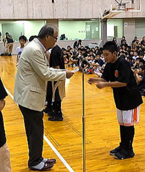 磐田地区のミニバスケットボール大会決勝戦・閉会式が アミューズ豊田にて開催されました 頑張っている子どもたちを応援したいと 毎年ミニバスケットボール連盟に活動助成金を贈っています 助成金は優勝チームへのトロフィーや、優秀選手たちに贈られる メダルの一助として使われています 優秀選手のみなさんへ記念品を手渡す鈴木会長 子どもたちの健やかな成長を願っています