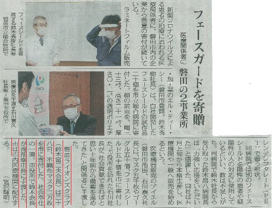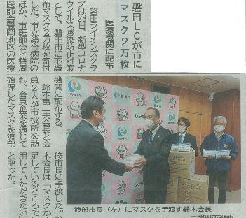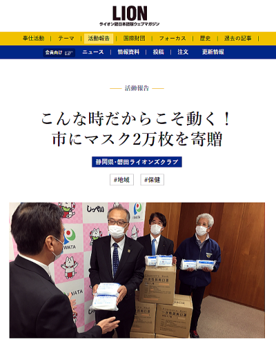 マスク2万枚を寄付 新型コロナウィルスの感染が広がり いくつもの奉仕活動が中止を余儀なくされました そんな中、いま私たちにできることはないかと考え 医療機関等へマスクの寄付を決定 鈴木会長から渡部磐田市長へ(磐田市役所にて) (磐田市総合福祉会館 iプラザにて) 磐田市を通じて、市立総合病院をはじめとする 医療機関におくられます ライオン誌ウェブ版でも紹介されました 静岡新聞 2020年4月30日掲載 中日新聞 2020年4月29日