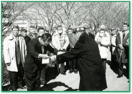 | 昭和63年に磐田ライオンズクラブ30周年記念事業として、県有空き地だった今之浦川沿いに桜48本を植樹、毎年2回、会員が下草刈の作業等を行い整備してきた。現在では市内有数の桜の名所として、市民に親しまれ憩いの場になっている。 そこで、本年度は3年後に50周年を迎えるに当たり、市町村合併による新磐田市誕生を記念し、先取り事業としてライオンズパーク(桜公園)の整備をした。 なお、下草刈りなど地元二之宮二丁目自治会の皆さん、近くの中部電力(株)磐田営業所の職員の皆さんにもご協力いただき、共に汗を流していただきました。 |