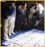 | 書家L.大橋良水先生のもと、慎重に入選作品の選考をするメンバーたち。 | 来場した父兄たちとにこやかに談笑する小林会長。 |