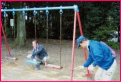 | 鎌田神明宮に隣接するうさぎ山公園は、近隣の子供たちだけでなく、多くの人々が利用する公園です。遊具の安全は大切な課題。安全点検を兼ねて、ペンキで化粧直ししました。 磐田ライオンズクラブは、市内の公園を毎年一箇所を選定して遊具の点検と塗装を行なっています。 |