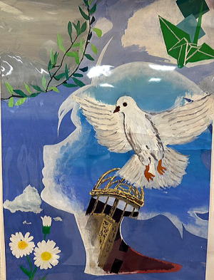 白い鳩、ガーベラ、緑のつるで平和への願いを表現した作品です